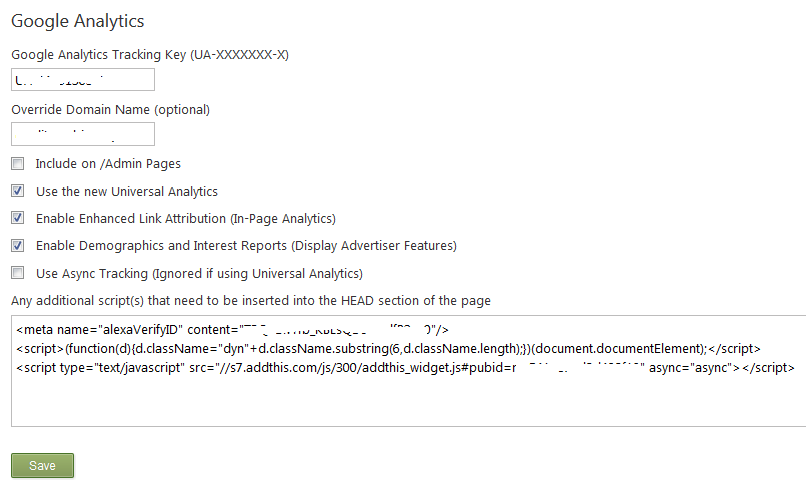 Updates include: - Support for Enhanced link attribution - Support for Demographics and Interest Reports - Fix for Doubleclick.net Network / Adsense - Now supports injecting/adding any other scripts, tracking tags, meta, etc. that you have from other sites such as Alexa, Bing Webmaster tools, etc.