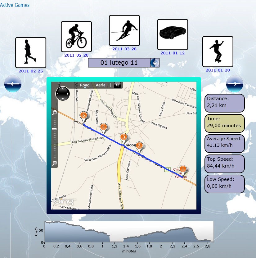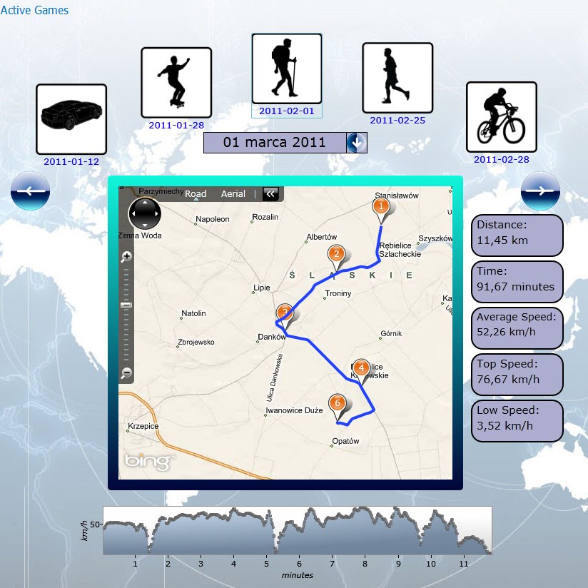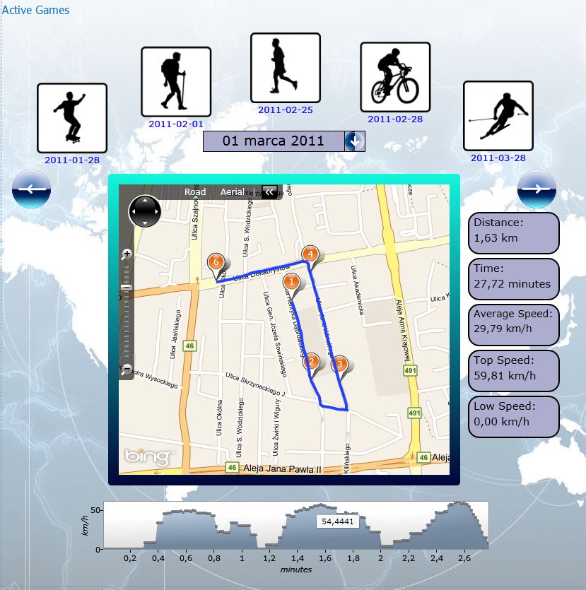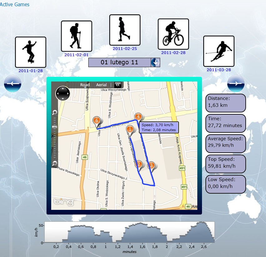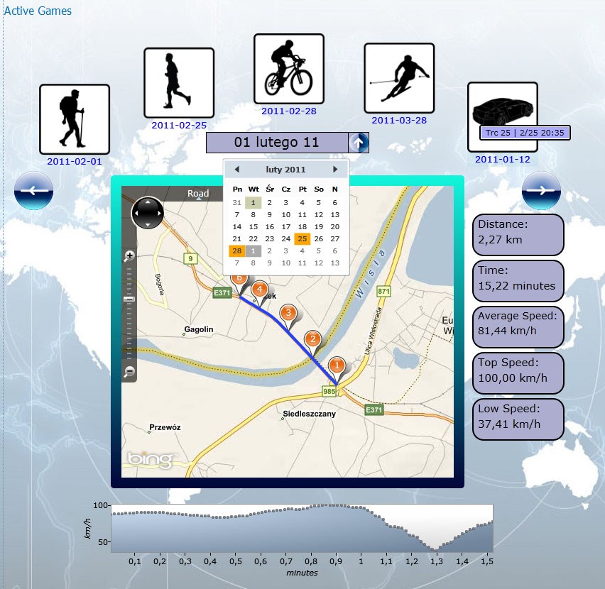 Module Active Games for Orchard platform, is aimed at promoting healthy lifestyles through sharing information about Active Games members routes and achievements gained by the various tasks associated with an application on Windows Mobile Phone 7 of the same name. This application allows you to record tracks and complete tasks generated by it, then sent the information to database using Windows Communication Foundation service. Presented additive allows you to collect data from the database and showing them to the other people. Each user can display, on his website, route by Bing Maps and check various information about the course of this tour as speed and time in which it was completed. The viewer may find the route that he or she will go through this route more quickly, writing down the ID of the route, viewer may wanted from his application on the cell to form the same for him. Another important part of the additive, which will be implemented soon, will be projected achievements. Person who enters the side of persons with this add-on will be able to compare them with their achievements, which have the task of bring healthy competition that will ultimately improve health status, because the sport is healthy. Test Account : "Marcel"