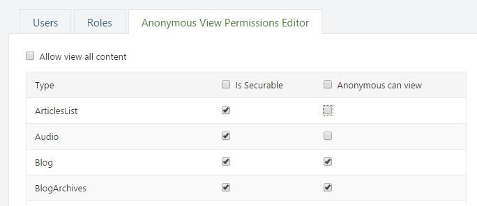 This module allows to manage anonymous role view permissions. It adds extra tab at /Admin/Users page. It allows easy to make content type securable and edit anonymous view access for it.