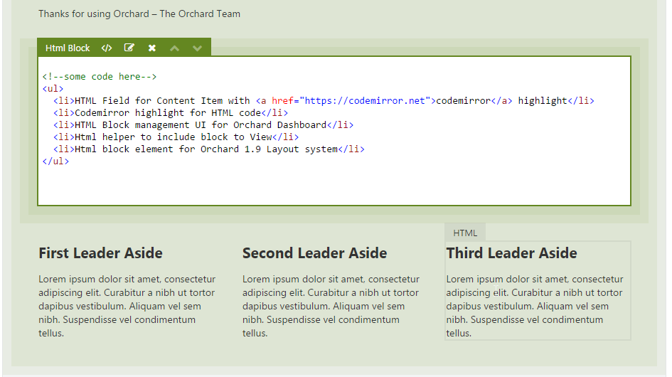 Here is Html Block Element to use it in Orchard 1.9 Layout system.