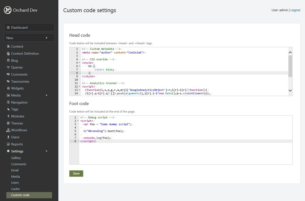Custom Code 1.1 Download Tool to insert custom code (script, meta, style...) in page head and foot.