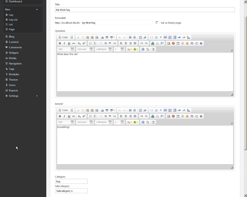 How to use: - Create FAQ items and give them a Category. - Create a FAQ List item and give that the same Category. - Open the FAQ List on your website and enjoy!