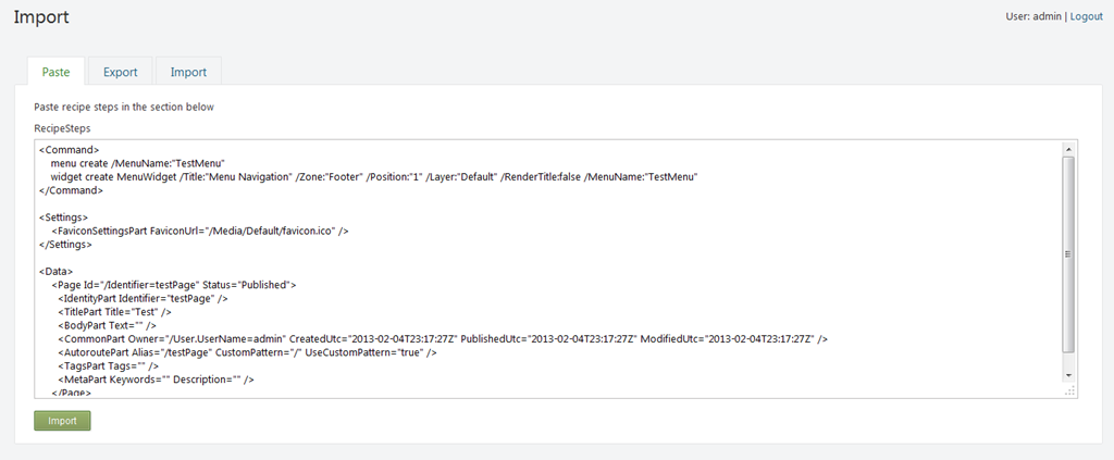I often run into the desire to quickly run a recipe step. This module adds a menu item to Import/Export that allows you to paste xml recipe steps.