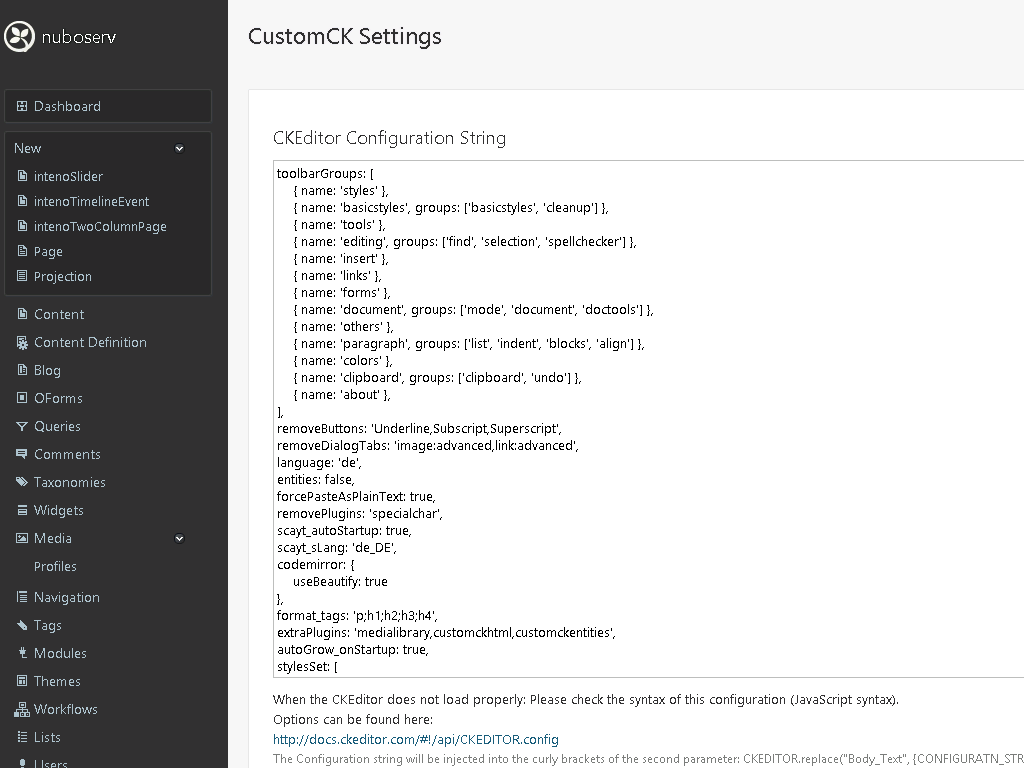 We do not actively manage the configuration parameters of CKEditor itself. Instead we let the developer/administrator define the configuration completely as a JavaScript object. So you are free to use another version of CKEditor just by replacing a folder and then adapt the configuration string on your own needs according to the official CKEditor documentation.)
