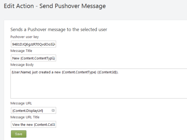 Messages can be constructed using tokens for most fields, so you can completely customise your messages depending on the event that has been triggered.