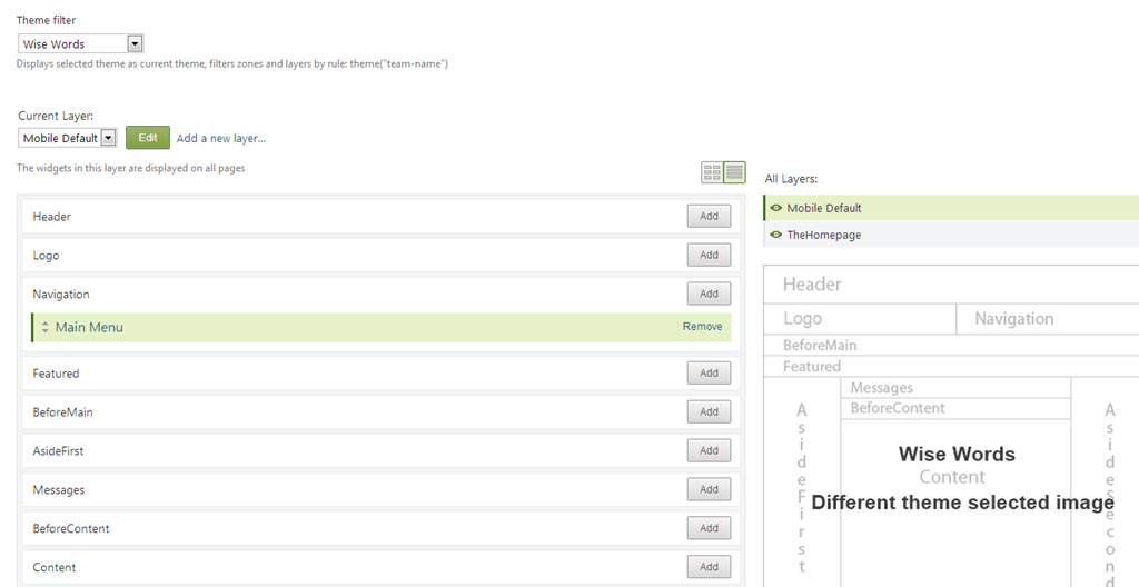 Filter widget zones and layer by selecting 1 of the enabled themes.