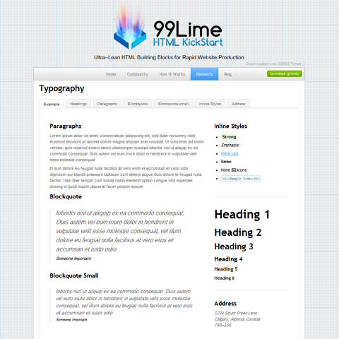 This theme is based on the excelent HTML KickStart; "HTML KickStart is an ultra–lean set of HTML5, CSS, and jQuery (javascript) files, layouts, and elements designed to give you a headstart and save you 10's of hours on your next web project."