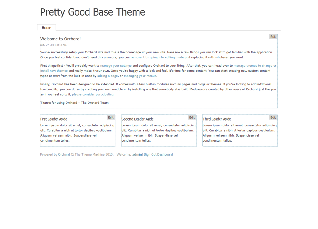 Pretty Good Base Theme 1.3.3 Download PGBT is an Orchard theme that aims to provide a set of common markup and styling so other