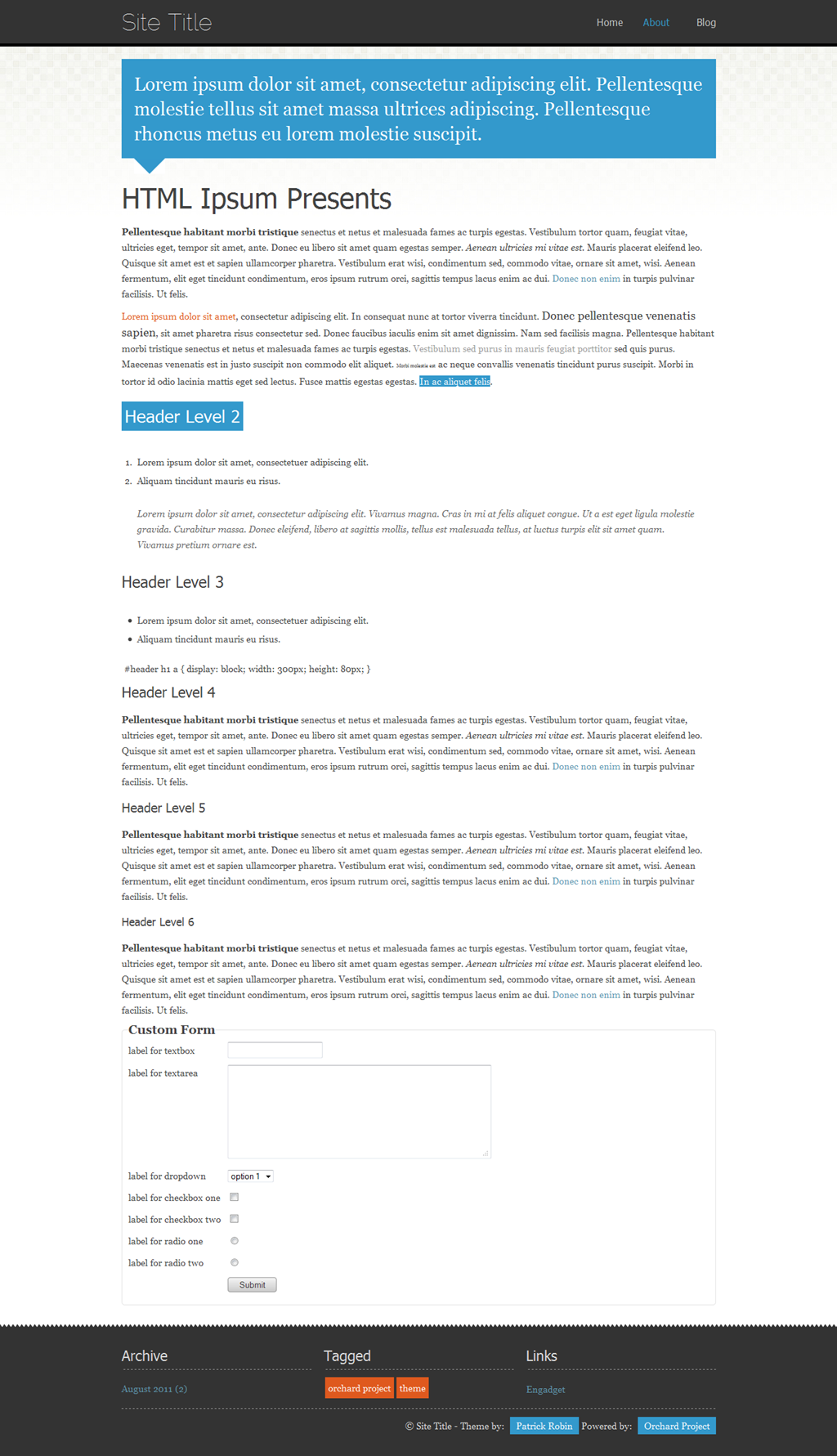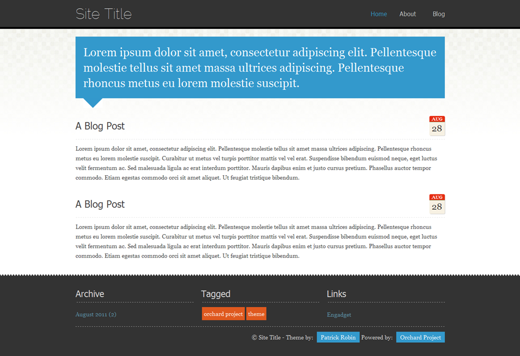 The Pool is a clean and simple theme that's ideally suited to a blog or personal website, to use the featured text box simply add a div with a class of 'featured'. The theme can be seen in action at http://www.patrickrobin.co.uk.
