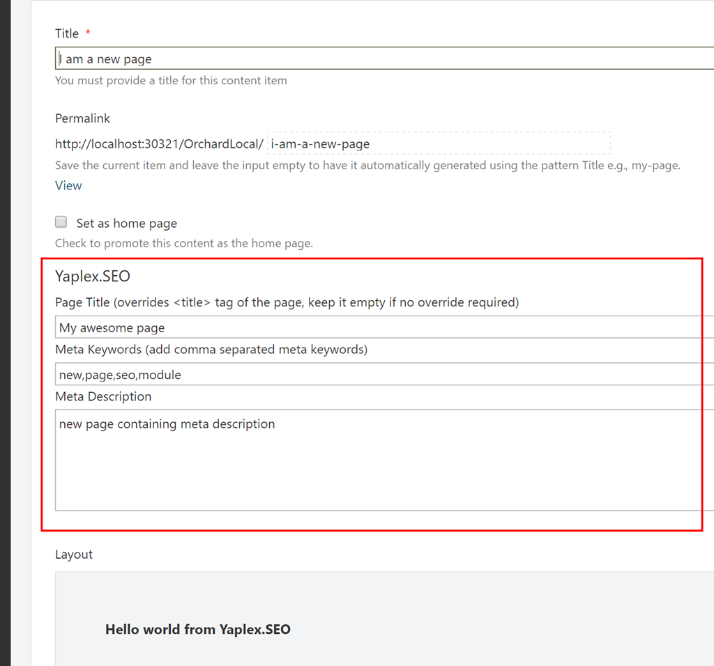 Yaplex.SEO is a search engine optimization module designed for Orchard CMS. The major features are: