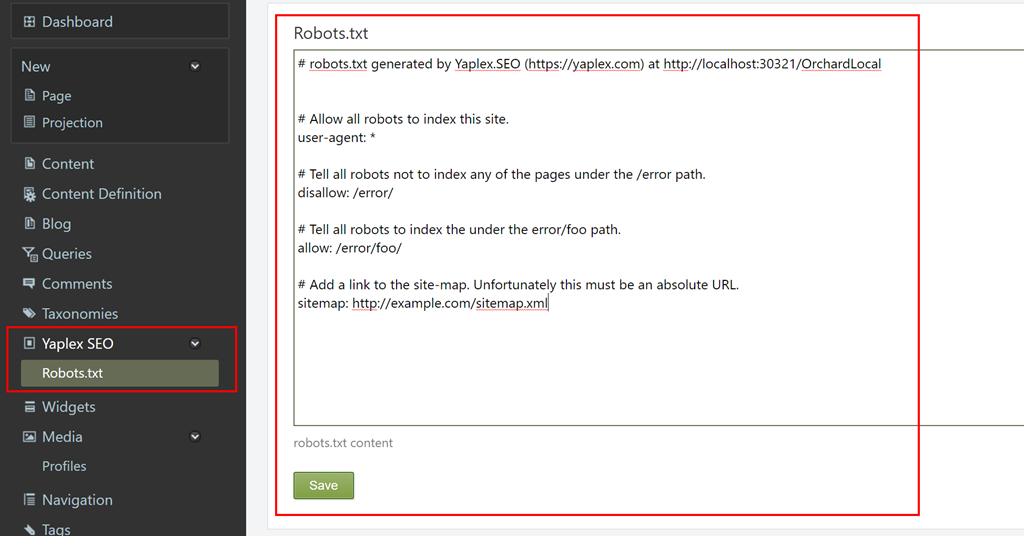 Yaplex.SEO is easy to use, just install it from Orchard Gallery and you will notice new SEO section when creating new page or editing existing page. Also you will notice robots.txt menu item on the left.